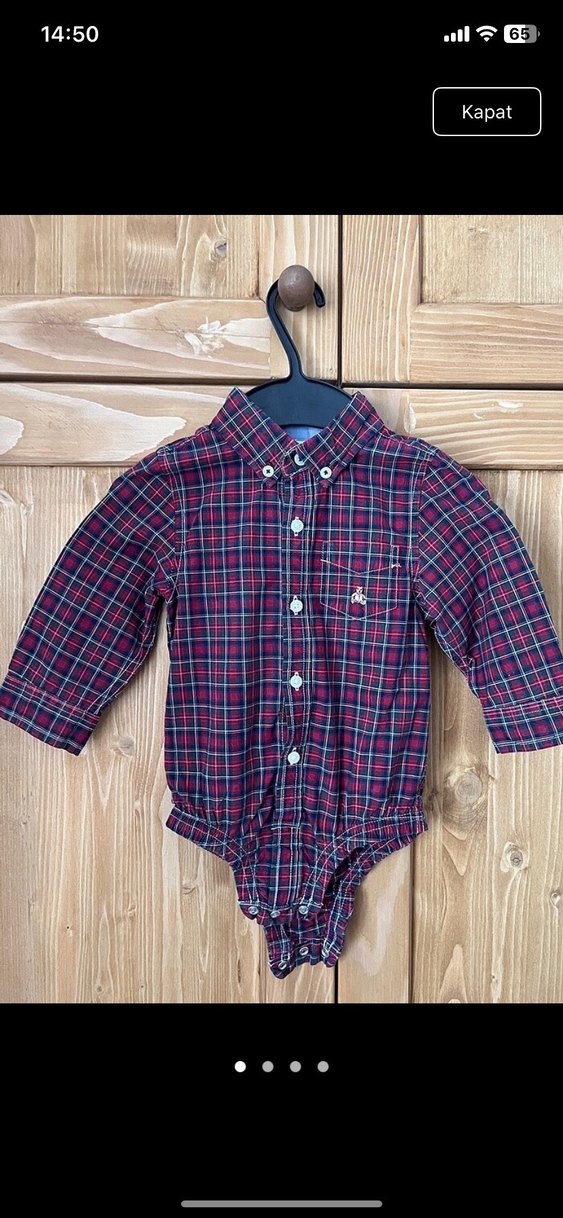 Bordo renkli, pamuklu kumaştan, ekoseli desenli, düğmeli ve uzun kollu, fit kesim erkek bebek gömlek body.