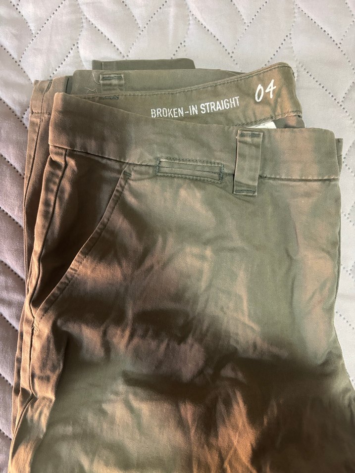 Haki renginde düz ve midi boy, 'BROKEN-IN STRAIGHT' yazılı rahat kesim kadın pantolonu. Günlük sokak stiline uygun.