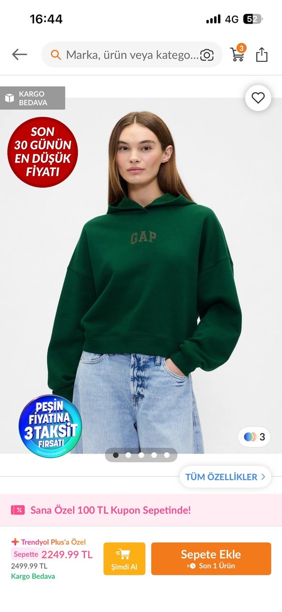 GAP markalı, koyu yeşil renkli, yumuşak ve rahat kumaştan üretilmiş, kapüşonlu, uzun kollu ve bol kesim sweatshirt. Sokak stiline uygun, baskılı logo detaylı.