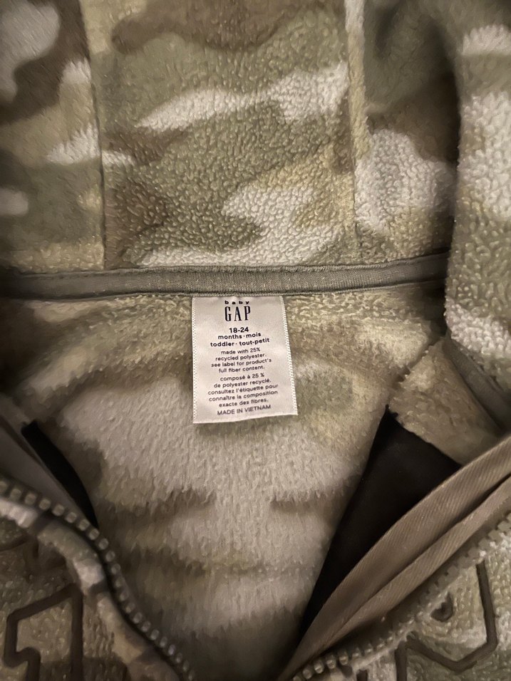 GAP markalı, gri kamuflaj desenli, kapüşonlu ve kürklü detaylı erkek polar. Rahat ve sokak stiline uygun, günlük kullanım için idealdir.