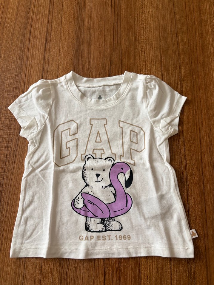 Pamuklu, beyaz, kısa kollu, baskılı ve fitted kesim kız çocuk tişörtü. Önünde pembe flamingo ile ayı ve "GAP EST. 1969" yazısı bulunur.