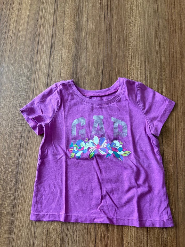 Mor renkli, pamuklu, kısa kollu kız çocuk tişörtü. Renkli baskılı GAP logosu ve çiçek detayları bulunur. Salaş kesim, yuvarlak yaka.