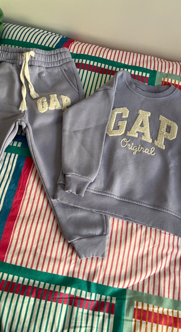 GAP markalı gri renk, nakışlı kız çocuk eşofman takımı. Rahat kesim, crew neck üst ve fleece kumaş pantolon ile sokak stiline uygun.
