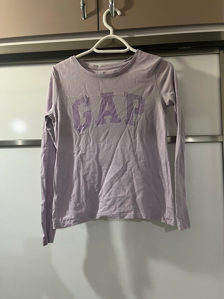 Gap kız çocuk tişörtü, uzun kollu ve yuvarlak yakalıdır. Pamuklu, pastel mor renkte, baskılı GAP logosu ile rahat ve şık bir görünüm sunar.
