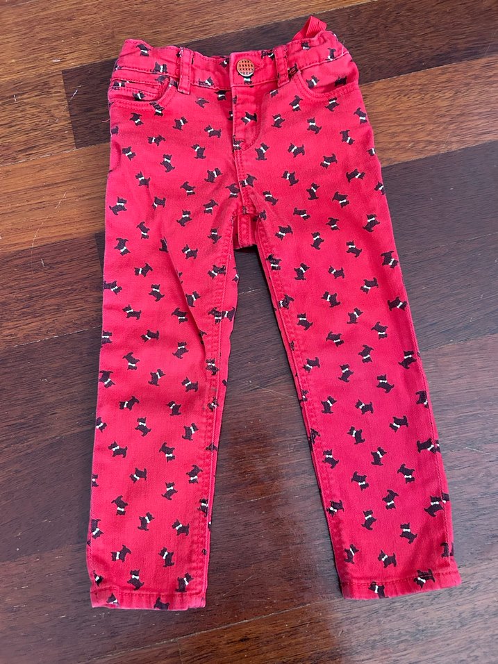 3 yaş. Kırmızı renkli, köpek desenli ve beli lastikli kız pantolon, trend sokak tarzı için uygundur.