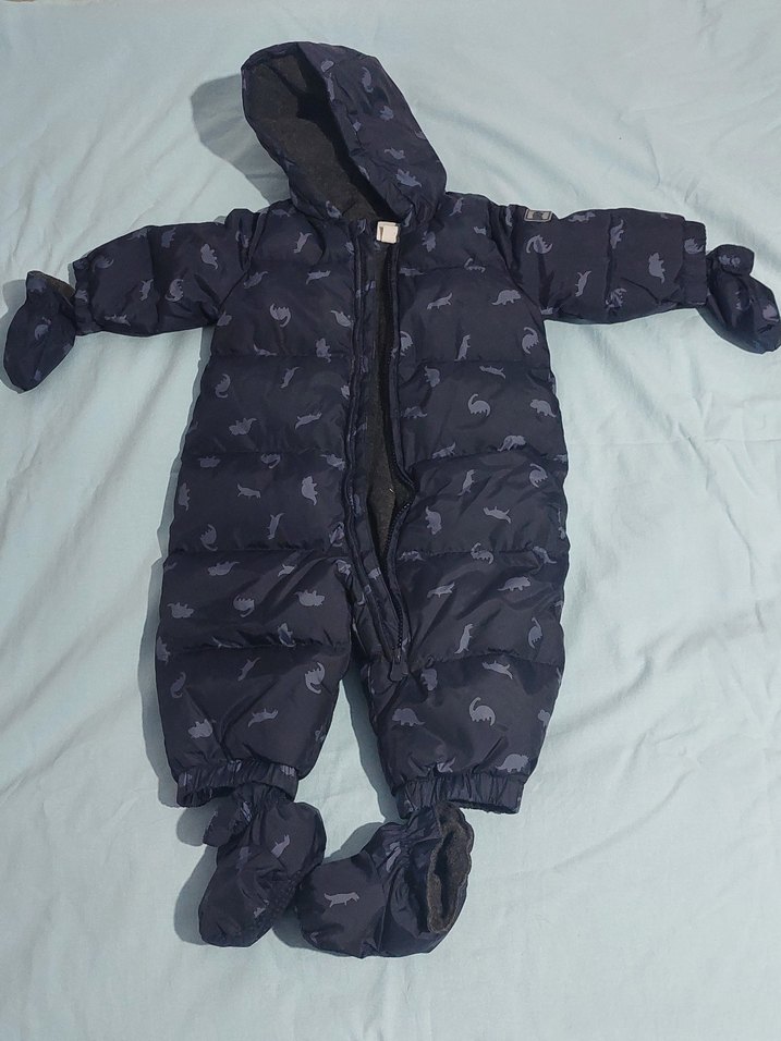 Lacivert renkli gri dinazor desenli, fermuarlı bebek tulumu, yumuşak ve sıcak kumaşlıdır. Eldiven ve ayak koruyucuları mevcuttur. İçi yumuşak polar, üşütmez ve terletmez. 1 kez kullanıldı 6 - 12 ay içindir.