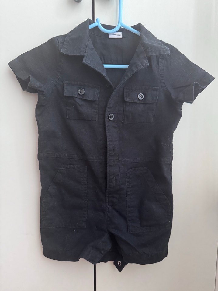 Siyah keten kumaştan, kısa kollu, düğmeli ve yakalı bebek erkek tulum. Sadece 2 kez giydirebildim . Yepyeni