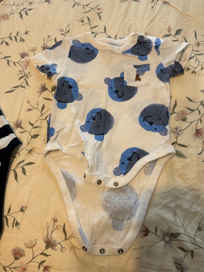 Gri renkli, kısa kollu, bisiklet yakalı bebek body. Mavi ayı baskılı ve düğmeli, yumuşak ve sıcak kumaştan yapılmıştır.