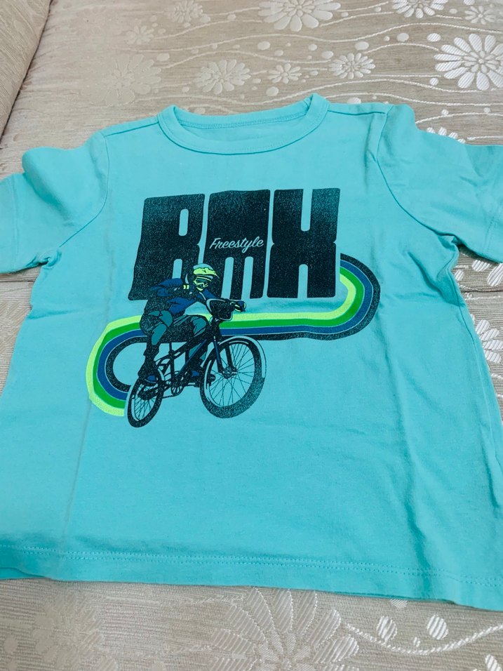 Pamuklu, mavi renkli, kısa kollu ve yuvarlak yaka cocuk tişörtü. BMX temalı renkli bisiklet baskısı ve tokalı detay içerir. ♂️