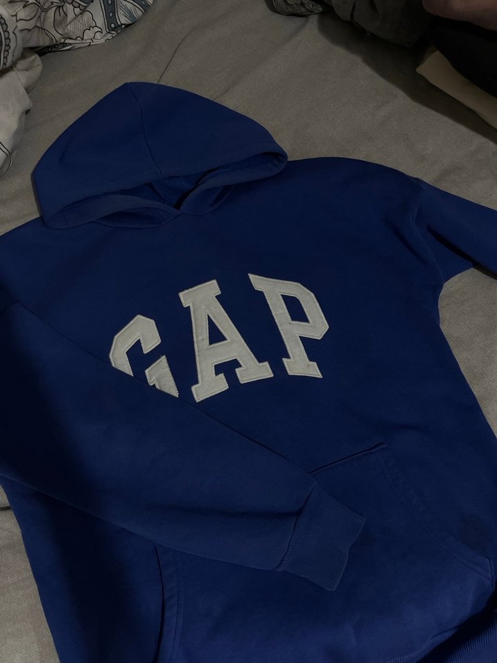 sweatshirtü koyu mavi renkte ve önünde baskılı GAP logosu ile. Rahat kesim, uzun kollu ve yuvarlak yakalı, yumuşak ve sıcak kumaştan yapılmıştır. Fermuarlı detay içerir, gündelik kullanım ve sokak tarzı için uygundur.