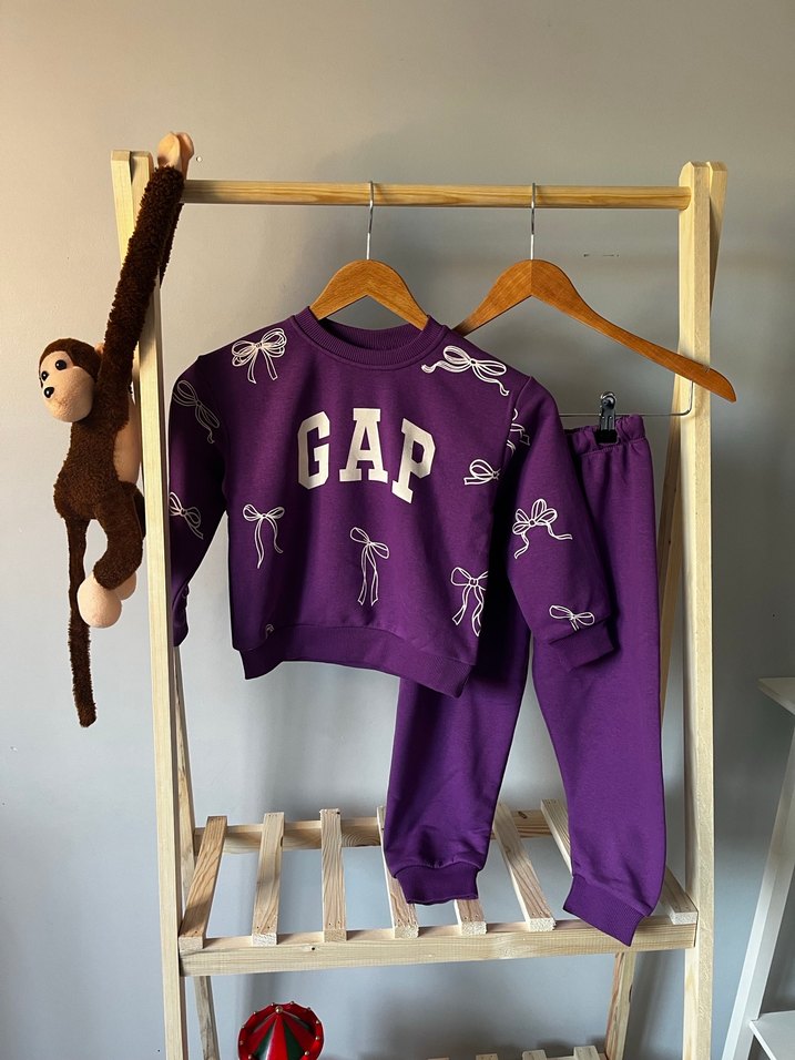 GAP markalı, mor renkli, kız eşofman takımı. Üstü bisiklet yaka, ve baskılı kurdele desenlidir. Rahat ve sıcak dokusu ile sokak tarzı. 4-5 7-8 yaş