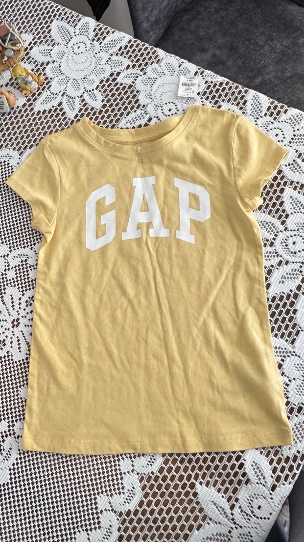 Sarı pamuk kumaştan, kısa kollu, bisiklet yaka ve bol kesim kız çocuk tişörtü. Üzerinde baskılı GAP logosu bulunur. Rahat ve günlük tarz. 6/7 yaş açık sarı gap logo