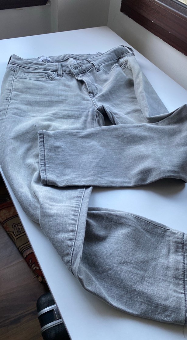 Gri renkte, normal boyda ve bol kesim denimden yapılmış kadın pantolon, gündelik kullanıma uygun sade ve şık bir görünüme sahiptir.