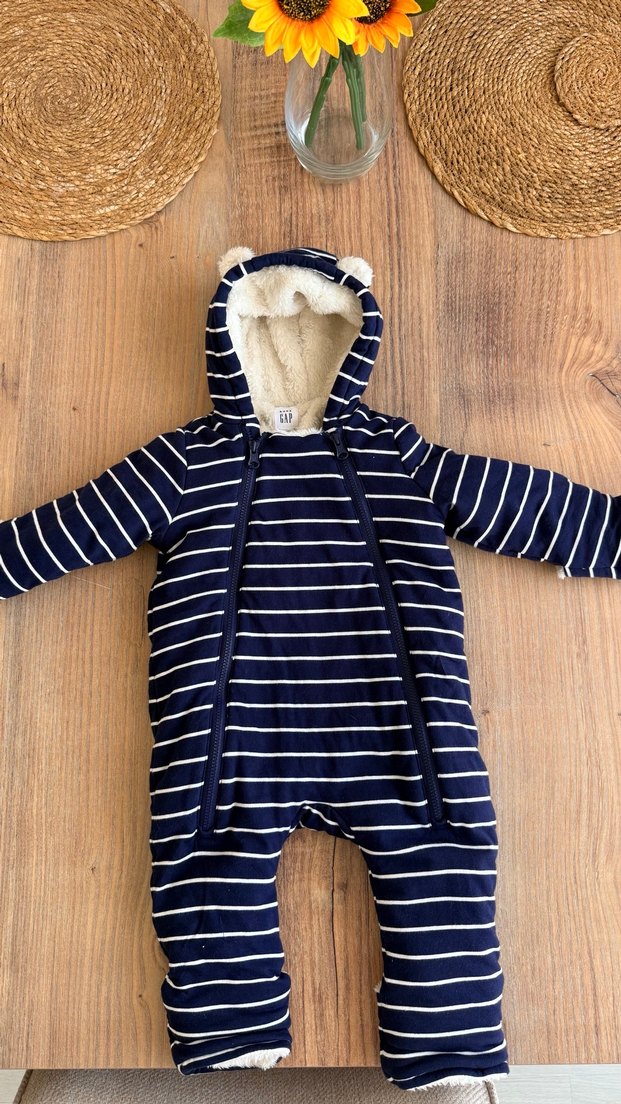 Orijinal gap ürünüdür. Bedeni 3-6 ay bebeğime küçük geldi hiç giydiremedim. Sadece etiketini söküp 1 kere yıkadım. Elleri ayakları kapanabiliyor fotoğraflarda göründüğü şekilde.