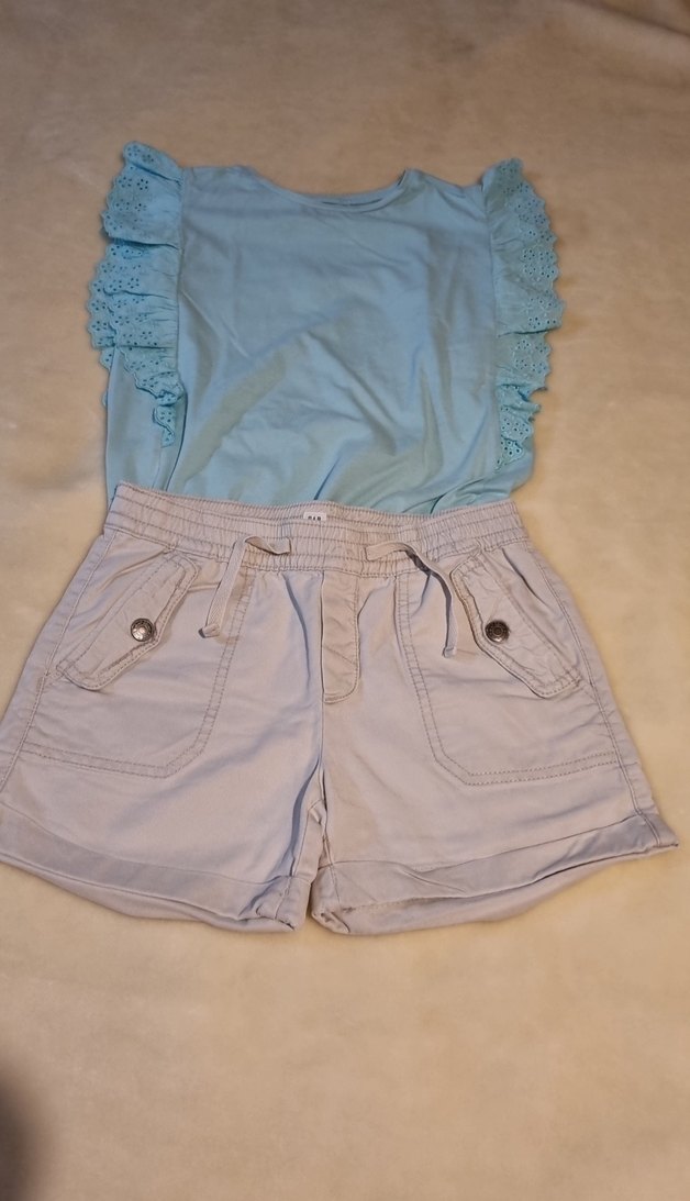 Fisto fırfırlı kısa kollu su yeşili penye üst ve GAP cepli krem açık renk şortlu kız kıyafet seti. 10 yaş, fotoğraflarda ölçüler mevcuttur. lütfen ölçüleri dikkate alarak alımı yapınız. iade kabul etmiyorum . herhangi bir yerinde defo ya da leke yoktur. kısa süreli ve temiz kullanılmıştır