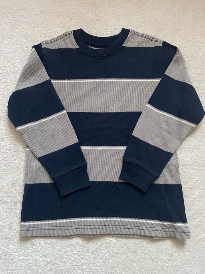 Uzun kollu, bisiklet yakalı, bol kesim gri ve lacivert çizgili erkek çocuk triko tişört. Yumuşak ve sıcak dokulu örme kumaştan yapılmıştır.