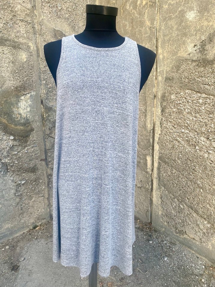 Kolsuz, yüksek yakalı gri triko elbise. Yumuşak sentetik/vizkon karışımlı triko kumaş, rahat ve salaş kesimli, günlük sokak tarzı için uygundur. Sorunsuzdur, giyilmemiştir. İki koltuk altı arası 57 cm, omuzdan alınan boy 95 cm’dir.