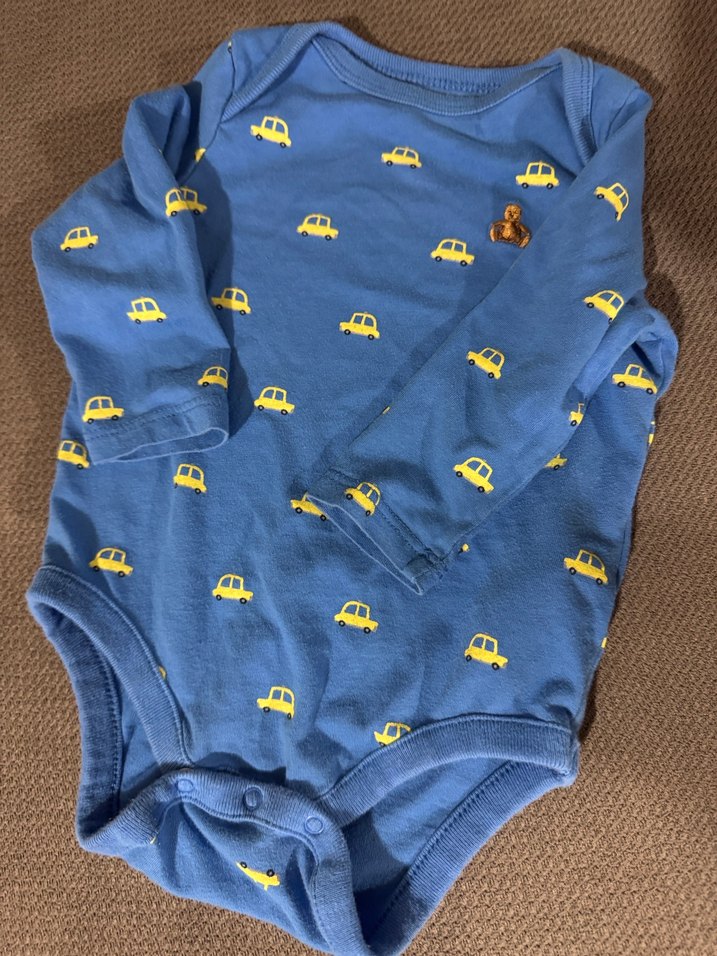 Mavi uzun kollu bebek body, boğazlı yaka ve düğmeli. Yumuşak ve sıcak kumaştan, küçük ayıcık detaylı ve sarı araba desenli.