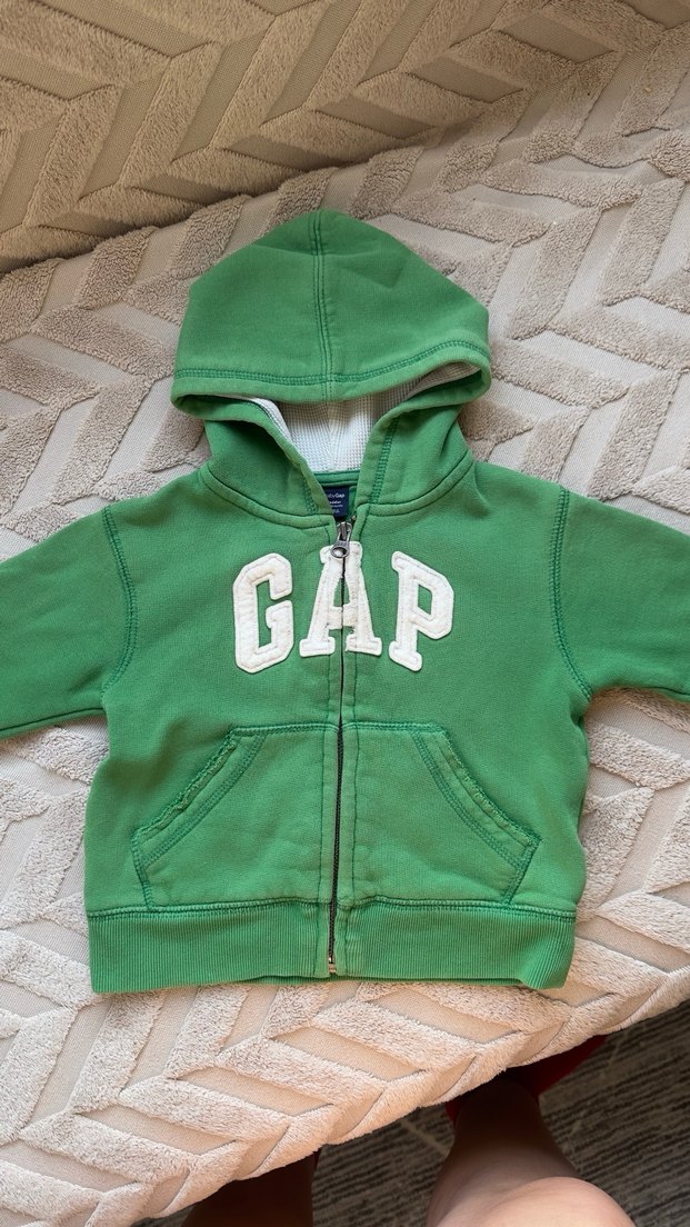 GAP markalı, yeşil renkli, kapüşonlu ve fermuarlı erkek çocuk sweatshirtü. Yumuşak ve sıcak kumaştan, uzun kollu, sade tasarımlı.