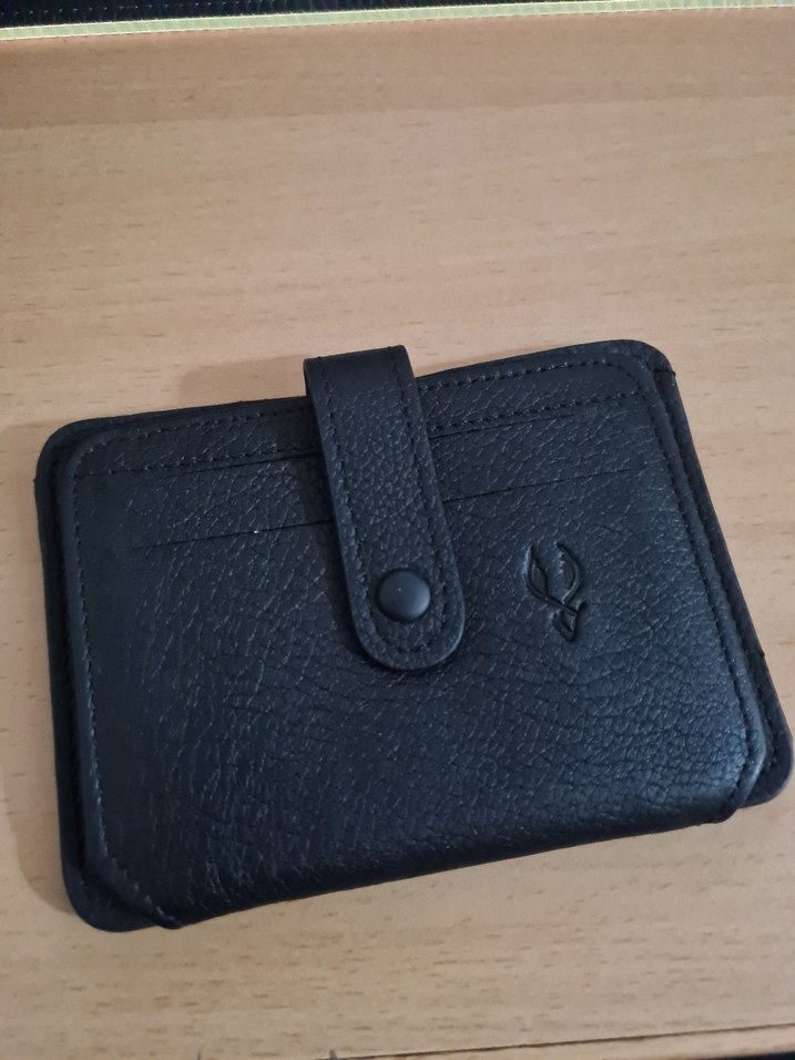 Siyah deri erkek cüzdan, minimalist ve biker tarzında. Düğmeli kapama ve çoklu kart bölmeleri bulunur.