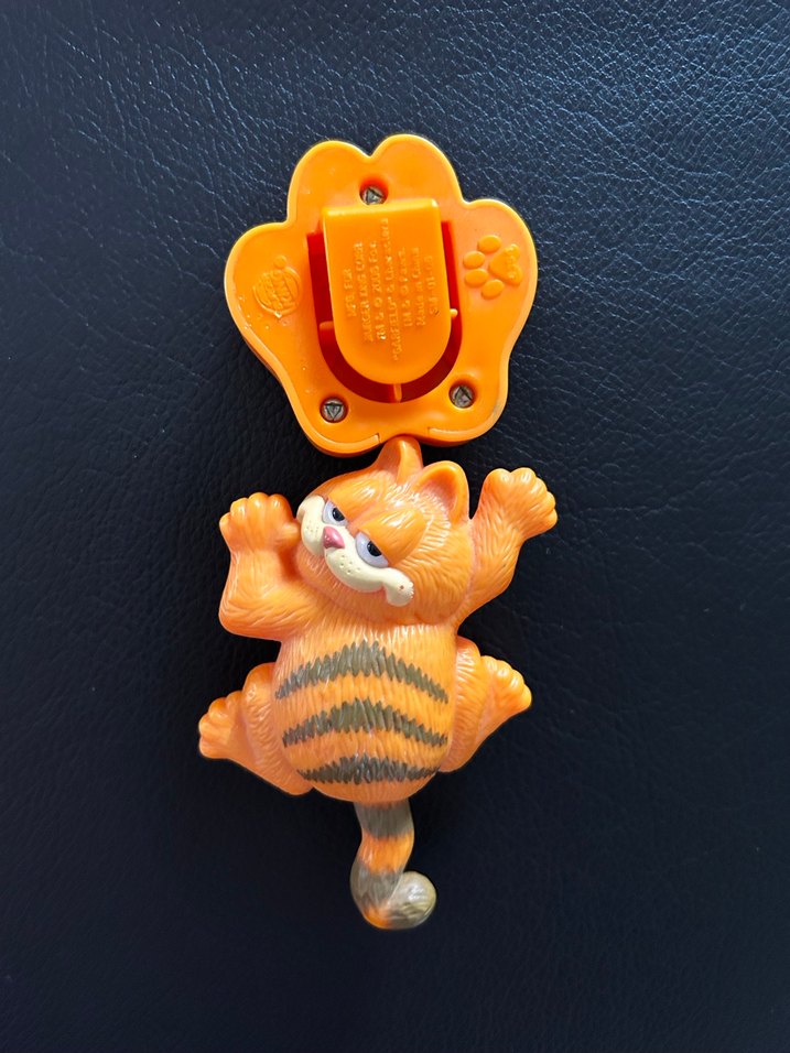Canlı renklerde, turuncu Garfield aksiyon figürü. Arkasında toka şeklinde bir tutucu bulunur. Çizgili detaylara sahiptir. #garfield