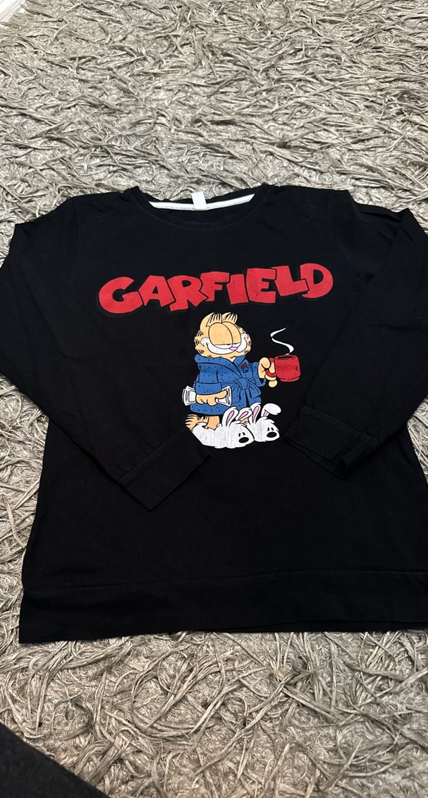Siyah, uzun kollu, Garfield baskılı, yuvarlak yaka , yumuşak dokulu sweatshirt. Günlük kullanıma uygun rahat ve konforlu tarz.