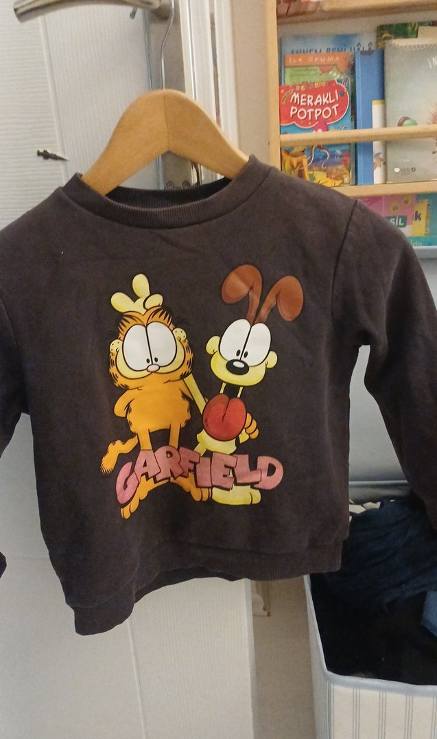 Garfield baskılı kahverengi erkek çocuk sweatshirt, uzun kollu ve bisiklet yaka. Yumuşak fleece kumaştan, bol kesim, rahat sokak stili için. Örgü detaylı.