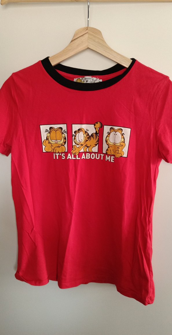 Pamuk kumaştan yapılmış, kısa kollu, Garfield baskılı kırmızı kadın tişörtü. Üzerinde "IT'S ALL ABOUT ME" yazısı ve renkli baskı bulunur. Günlük kullanım için uygundur.