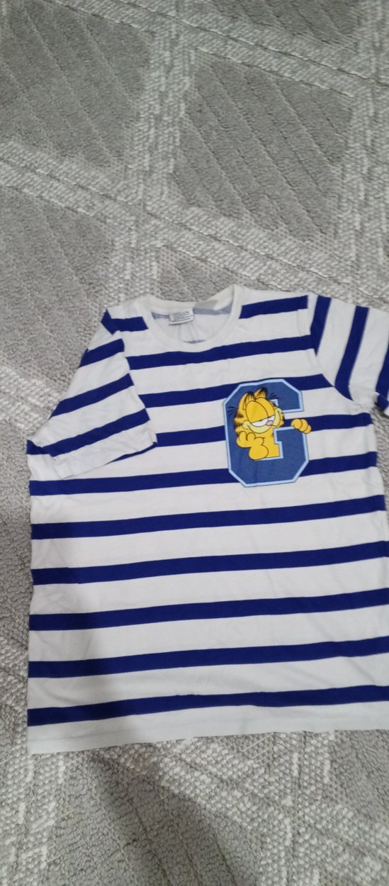 Kısa kollu, yuvarlak yaka, pamuklu ve örme dokulu erkek tişörtü. Renkli mavi çizgiler ve Garfield baskısı ile rahat ve trend sokak stili için uygundur.