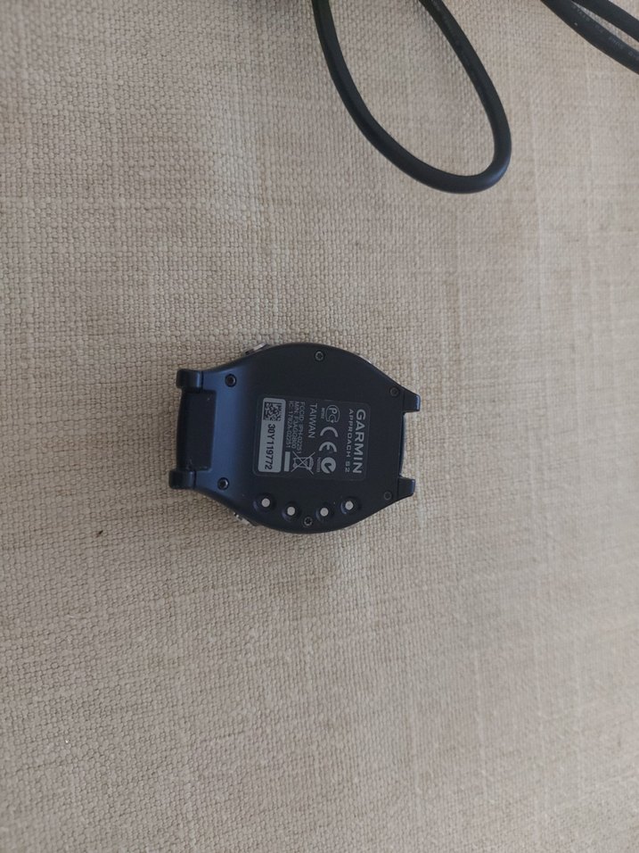 Arka kısmında şarj pinleri ve sensör bulunan siyah Garmin akıllı saat gövdesi, kayış takmak için uygun. şarj kablosu ile birlikte ⚫