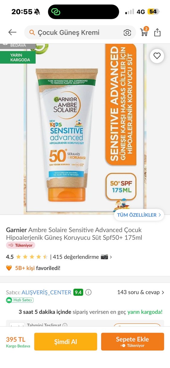 Garnier Ambre Solaire Sensitive Advanced çocuklar için SPF 50+ koruma sağlar. Hipoalerjenik yapısı ve seramid bakımı ile hassas ciltlere uygundur. 175 ml tüpte sunulur. ☀️