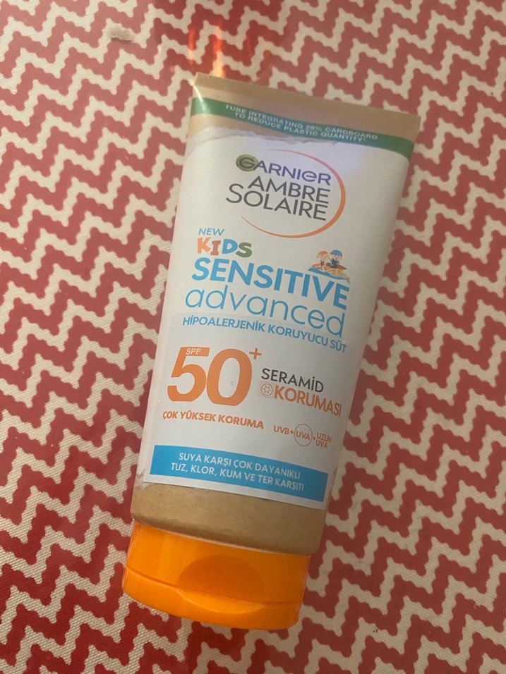 Garnier Ambre Solaire Kids Sensitive Advanced SPF 50+ çok yüksek koruma sağlar. Hipoalerjenik, suya dayanıklı ve seramid içerir. Hiç kullanılmadı trendyolda 354 tl hepsiburadada 370 tl Amazon carfursada daha pahalı