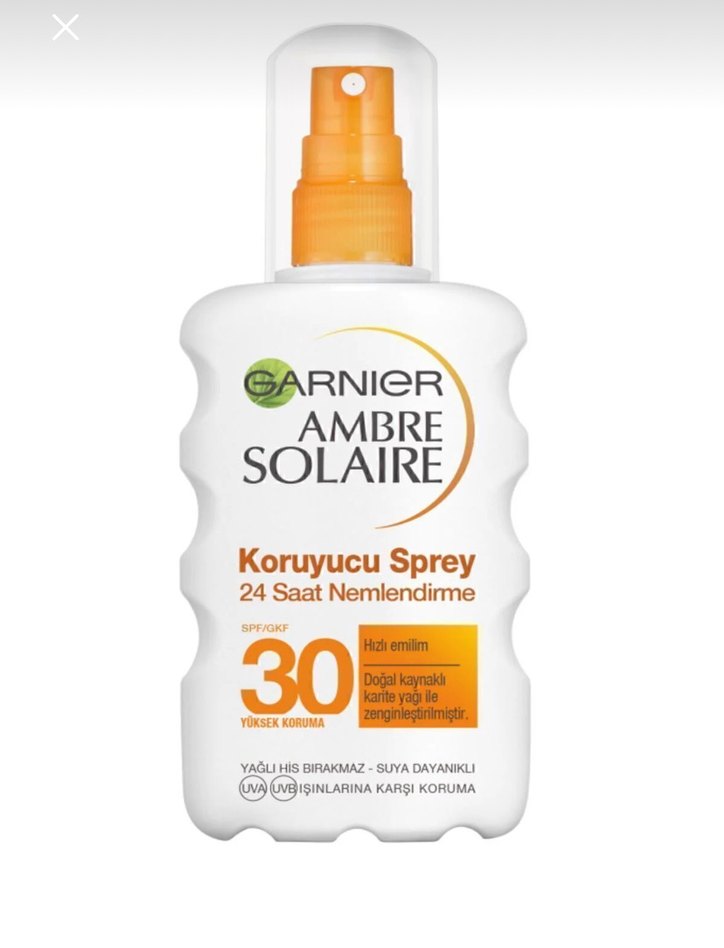 Garnier Ambre Solaire koruyucu sprey SPF 30 yüksek koruma sağlar, 24 saat nemlendirir. Hızlı emilir, suya dayanıklı, yağlı his bırakmaz, doğal karite yağı içerir. ☀️
