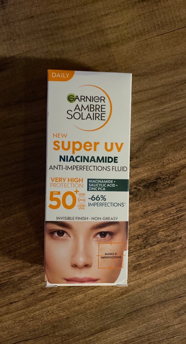 Garnier Ambre Solaire Super UV Niacinamide sıvı, SPF 50 çok yüksek koruma ve kusur karşıtı etkiler sunar. Görünmez ve yağsız bitiş sağlar. ☀️