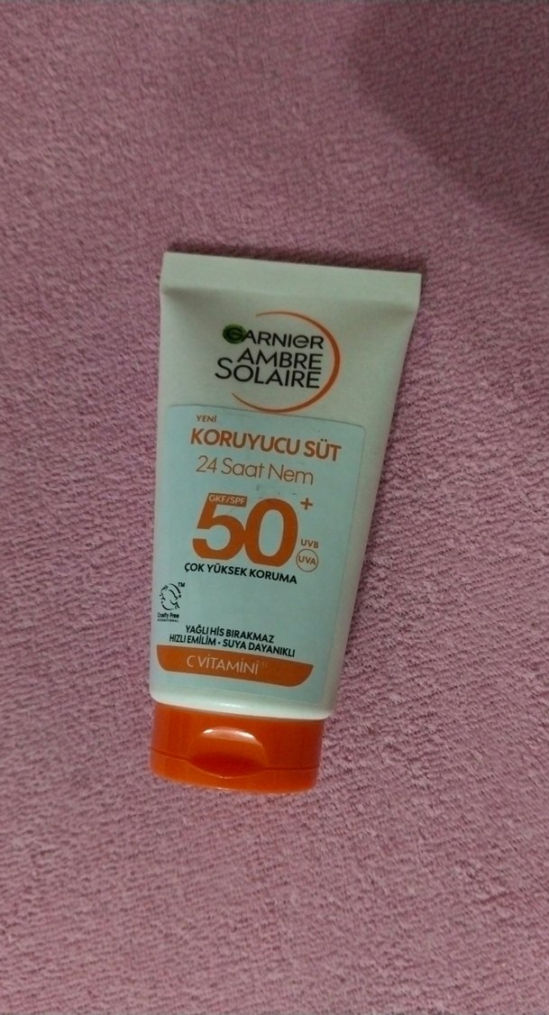 Garnier Ambre Solaire koruyucu süt, SPF 50+ çok yüksek koruma, 24 saat nem ve C vitamini içerir. Yağlı his bırakmaz, suya dayanıklıdır. ☀️