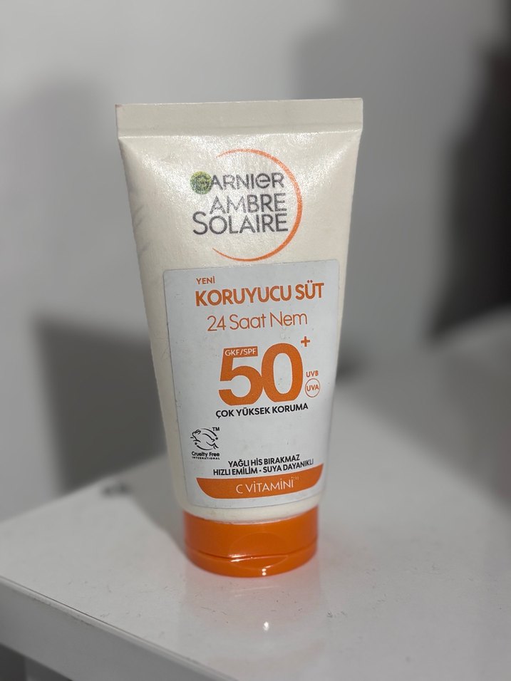 Garnier Ambre Solaire SPF 50 koruyucu süt, 24 saat nem sağlayan çok yüksek koruma sunar. C vitamini içerir ve suya dayanıklıdır. ☀️