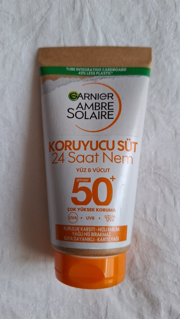 Garnier Ambre Solaire koruyucu süt, yüz ve vücut için SPF 50+ çok yüksek koruma sağlar. 24 saat nemlendirir, hızlı emilir, suya dayanıklı, yağlı his bırakmaz, karite yağı içerir. ☀️