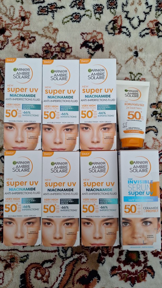 Garnier Ambre Solaire Super UV Niacinamide, SPF 50+ ile çok yüksek koruma sağlar, cilt kusurlarını %66 azaltan anti-imperfeksiyon sıvısı içerir. Görünmez, yağsız bitiş ve cilt koruyucu seramid içerir. adet 150 tl