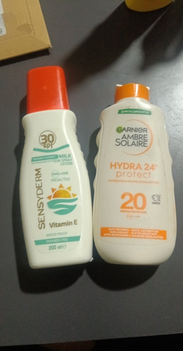 Garnier Ambre Solaire Hydra 24 Protect SPF 20 losyon ve Sensyderm Vitamin E SPF 30 süt sprey hızlı emilen, suya dayanıklı güneş koruyuculardır. Losyon hediyedir