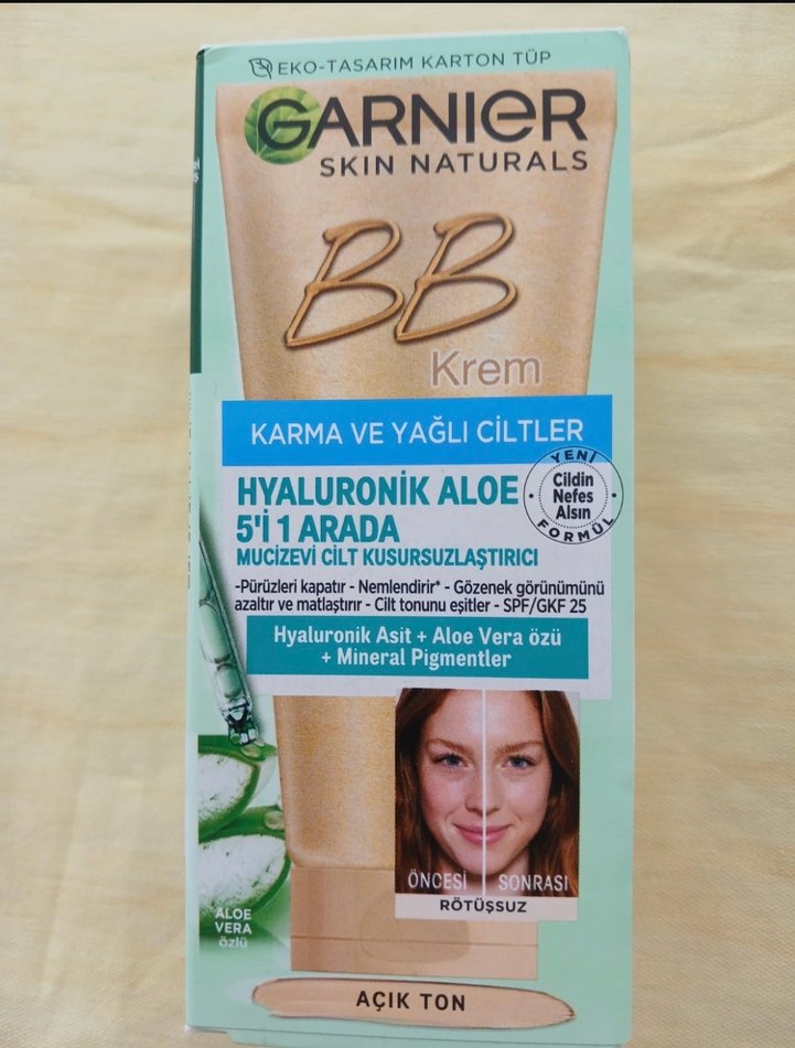 Garnier BB krem açık ton, karma ve yağlı ciltler için uygundur. Hyaluronik asit, aloe vera özü ve mineral pigmentler içerir. Nemlendirir, cilt tonunu eşitler, gözenek görünümünü azaltır ve SPF 25 koruma sağlar. kullanılmadı