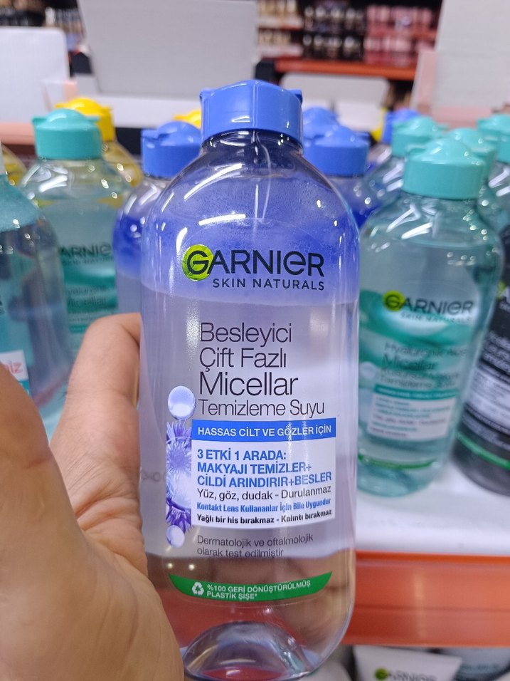 Garnier Skin Naturals besleyici çift fazlı micellar temizleme suyu, hassas cilt ve gözler için uygundur. Makyajı çıkarır, cildi arındırır, yağlı his bırakmaz. Garnier Besleyici Çift Fazlı Micellar Makyaj Temizleme Suyu 400 ml Besleyici mavi kantaron çiçeği suyu içeren micellar, micellar teknolojisi sayesinde ciltteki kalıntılara, makyaja ve yağ fazlasına mıknatıs gibi yapışır. Makyajı temizler, cildi arındırarak rahatlatır ve ovalamaya gerek yoktur. Mavi kantaron çiçeği suyu içeren besleyici çift fazlı micellar temizleme suyu size, suya dayanıklı ve uzun süre kalıcı makyajı zevkle çıkarmak için etkili bir çözüm sunar.