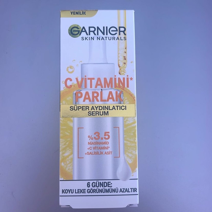 Garnier C Vitamini Aydınlatıcı Parlak Serum 30ml watsonstan yeni aldım hiç kullanılmadı Garnier Skin Naturals süper aydınlatıcı serum %3,5 niasinamid, C vitamini ve salisilik asit içerir. 6 günde koyu leke görünümünü azaltır.