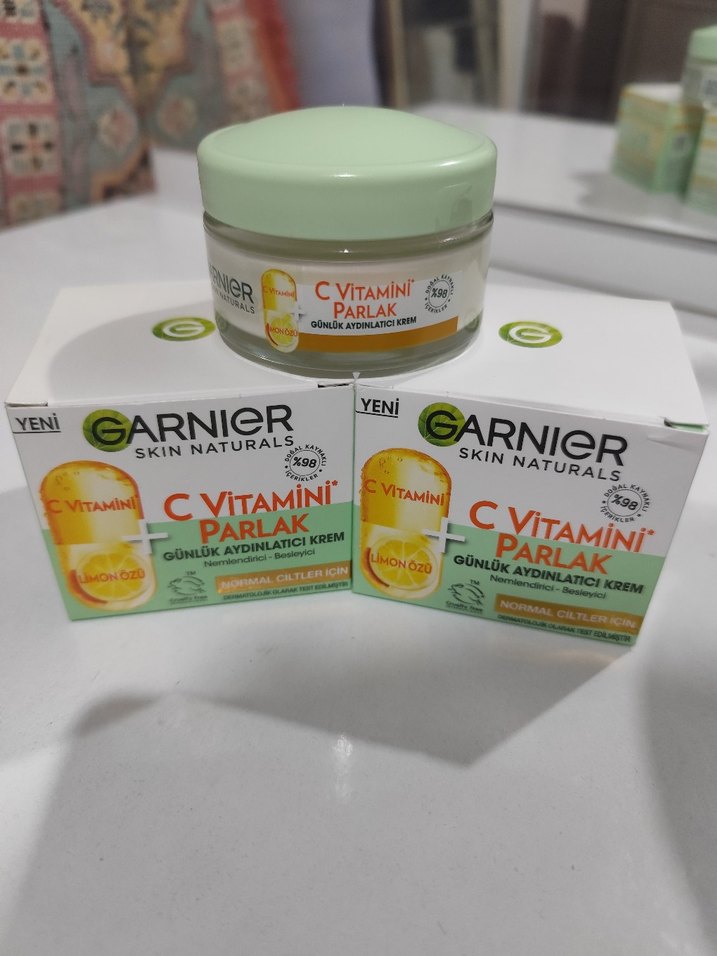 Garnier C Vitamini Parlak günlük aydınlatıcı krem, normal ciltler için doğal içeriklerle cildi aydınlatır.