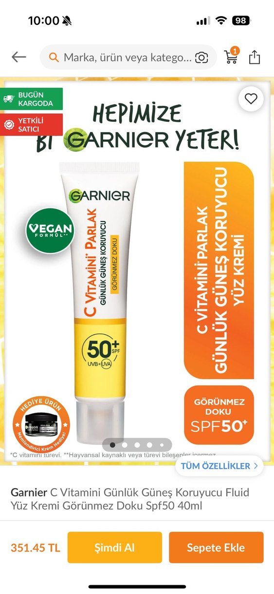 Garnier günlük yüz kremi C vitamini ile SPF 50+ koruma sağlar, vegan formüllüdür ve görünmez dokusuyla parlak cilt sunar. ☀️