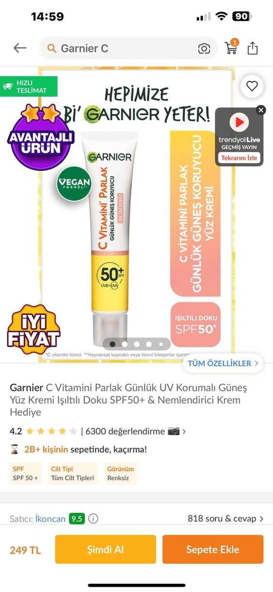 Garnier C Vitamini Parlak Güneş Koruyucu Yüz Kremi SPF50+