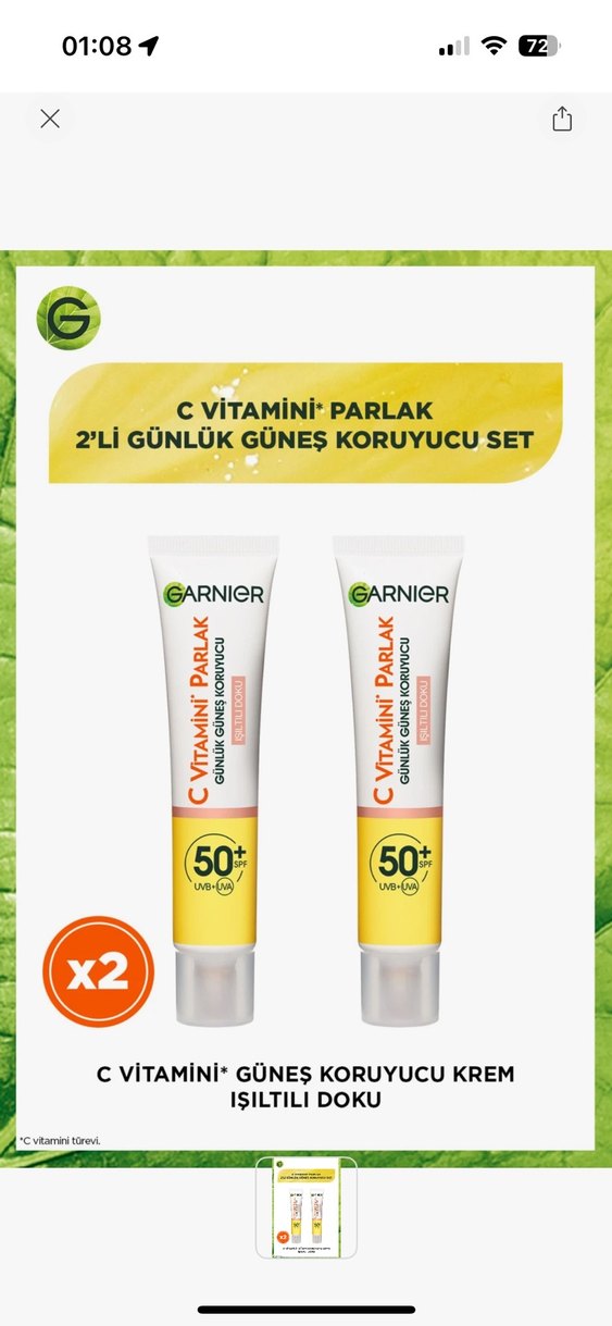 Garnier C Vitamini içeren, SPF 50+ korumalı, cildi parlak tutan günlük güneş koruyucu krem seti, 2'li paket olarak sunulur. ☀️