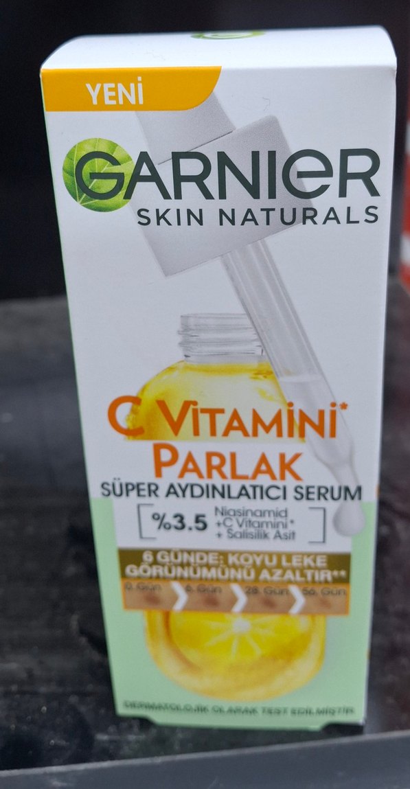 Garnier C Vitamini Parlak Serum %3.5 niasinamid, vitamin C ve salisilik asit içerir. 6 günde koyu leke görünümünü azaltır, cildi aydınlatır.