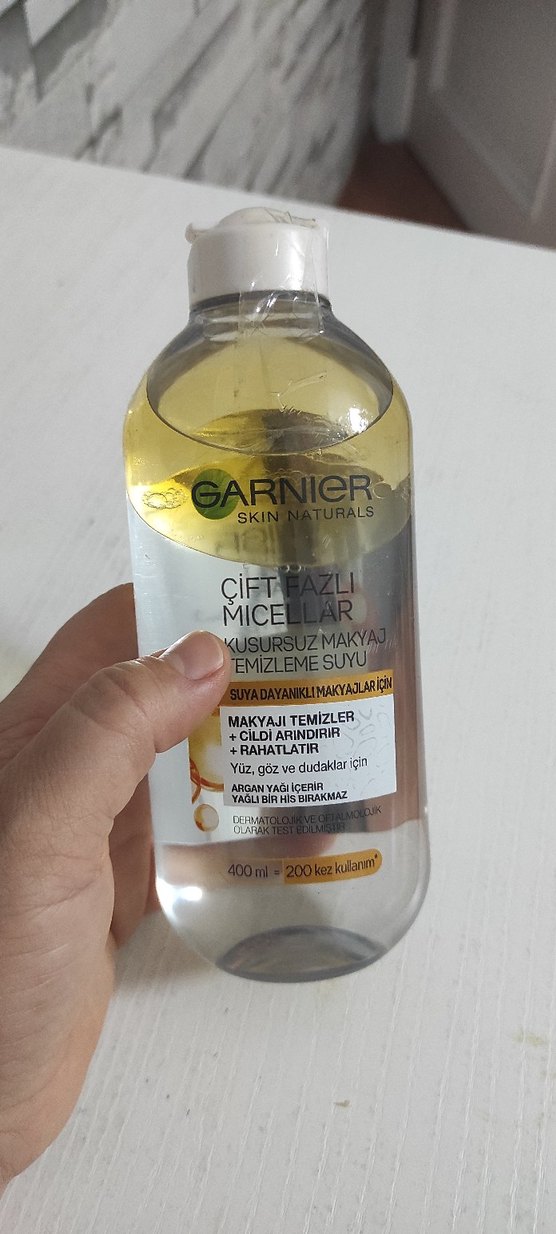 Garnier çift fazlı micellar su, yüz, göz ve dudak makyajını temizler, cildi arındırır ve rahatlatır. Argan yağı içerir, cildi yumuşatır.