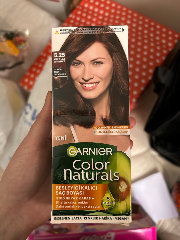 Garnier Color Naturals 5.25 Çikolata Kahve saç boyası, %100 beyaz kapama sağlar. Besleyici ve kalıcı renklerle saçları daha parlak ve ipeksi yapar. Vegan formüldür.