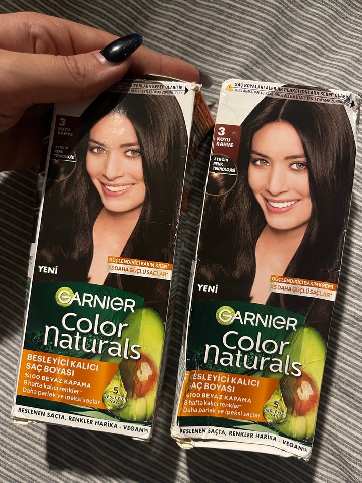 Garnier Color Naturals kalıcı saç boyası, 3 koyu kahve tonunda. Saçı besler, kalıcı renk ve %100 beyaz kapama sağlar. Vegan formüllü. Hiç kullanmadim boşa cıktı bunlar kizlar
